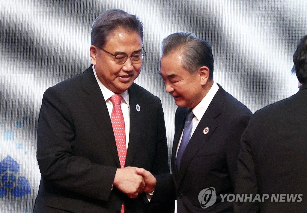 | ▲ South Korean Foreign Minister Park Jin (L) shakes hands with his Chinese counterpart Wang Yi in Phnom Penh on Aug. 4, 2022. (Yonhap) |