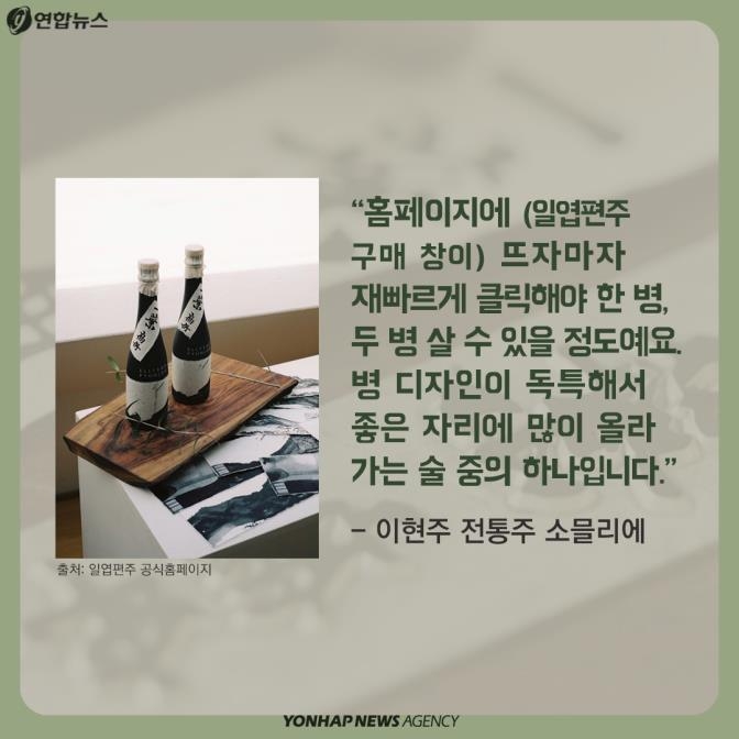 "홈페이지에 (일엽편주 구매 창이) 뜨자마자 재빠르게 클릭해야 한 병, 두 병 살 수 있을 정도예요. 병 디자인이 독특해서 좋은 자리에 많이 올라가는 술 중의 하나입니다."- 이현주 전통주 소믈리에