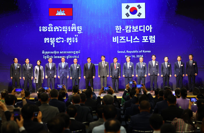 Cambodian Prime Minister Hun Manet (7th from L) and other participants gather for a group photo in the South Korea-Cambodia Business Forum at the Korean Chamber of Commerce and Industry in Seoul on May 16, 2024. (Yonhap)