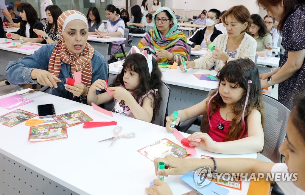 | ▲ K종이접기 체험하는 외국인 가족 (인천=연합뉴스) 김호천 기자 = 1일 오전 인천시 연수구에 있는 인천시교육청 교육문화공간 마을엔에서 열린 종이문화재단과 디아스포라연구소의 상호 협약식에 참석한 외국인 가족이 '코딱지들의 대통령' 김영만 종이문화재단 평생교육원장과 함께 종이접기를 하고 있다. 2023.7.1 khc@yna.co.kr |