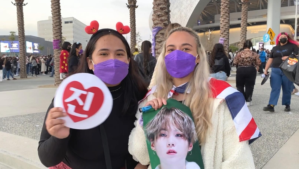 | ▲ 미국 텍사스 출신의 카트리나(왼쪽)와 영국 런던에서 온 에이브릴 (로스앤젤레스=연합뉴스) 정윤섭 특파원 = 2일(현지시간) 미국 텍사스 출신의 카트리나와 영국 런던에서 온 에이브릴이 BTS 콘서트를 앞두고 포즈를 취하고 있다. 2021.12.03 jamin74@yna.co.kr |