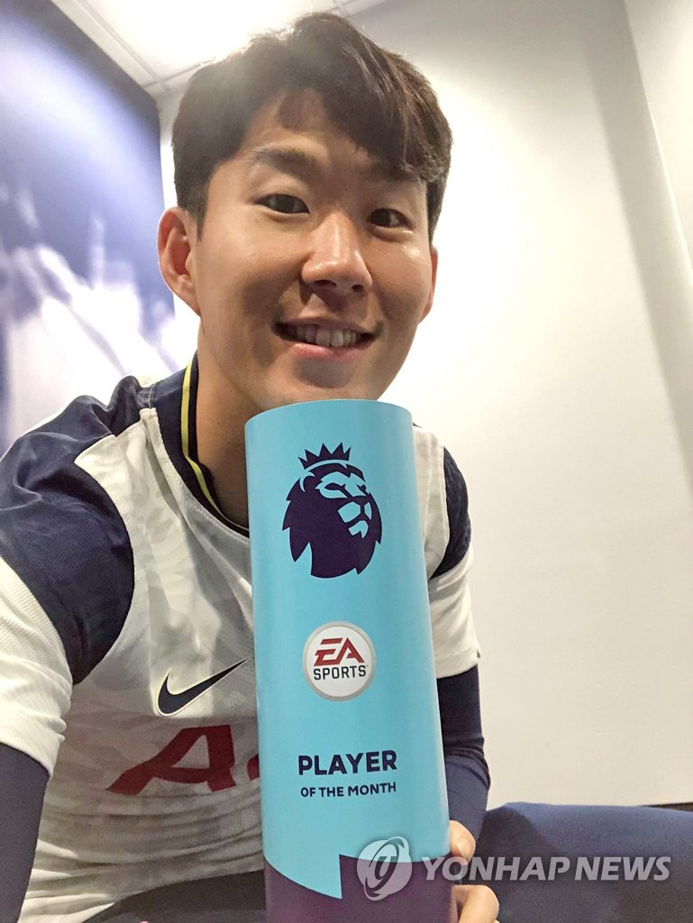 | ▲ This photo, captured from the Twitter account of Tottenham Hotspur on Nov. 19, 2020, shows the club's attacker Son Heung-Min holding up the EA Sports Premier League Player of the Month trophy for October. (PHOTO NOT FOR SALE) (Yonhap) |