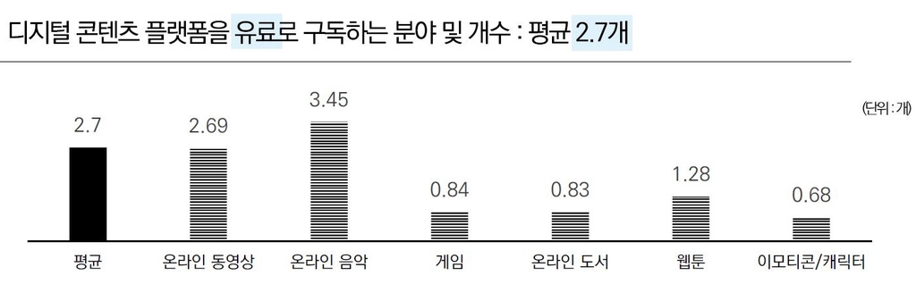 또한 디지털콘텐츠 이용자들은 온라인 동영상, 온라인 음악, 게임, 온라인 도서, 웹툰 등 평균 2.7개의 플랫폼을 유료 구독했다.