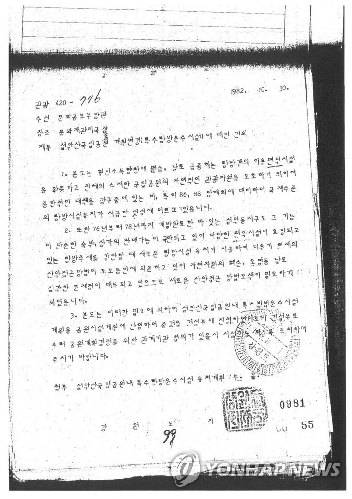 | ▲ 사업 추진 41년 만에 가능해진 설악산 오색케이블카 사업 (춘천=연합뉴스) 설악산 케이블카 설치 사업이 27일 환경영향평가를 통과하면서 사업 추진 41년 만에 사업 추진이 가능해졌다. 사진은 1982년 강원도가 문화공보부장관 앞으로 보낸 설악산 국립공원내 특수탐방운수시설 유치 계획 사본. 2023.2.27 [강원도 제공·재판매 및 DB 금지] dmz@yna.co.kr |