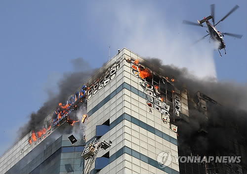 | ▲ This file photo shows a fire at Samsung SDS Co.'s data center in Gwacheon, just south of Seoul, on April 20, 2014. (Yonhap) |