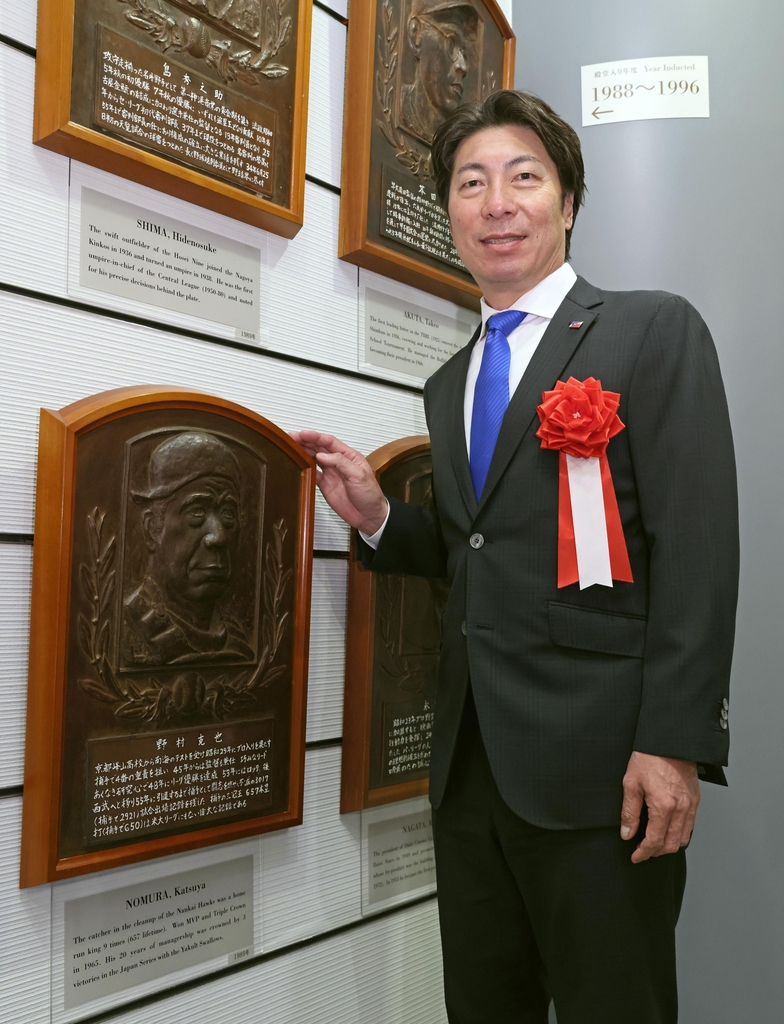 | ▲ 일본프로야구 명예의 전당에 입회한 다카쓰 신고 (교도 도쿄=연합뉴스) 다카쓰 신고 야쿠르트 스왈로스 감독이 14일 일본 도쿄에 있는 일본 야구박물관에서 '명예의 전당 입회'를 기념해 사진을 찍고 있다. |