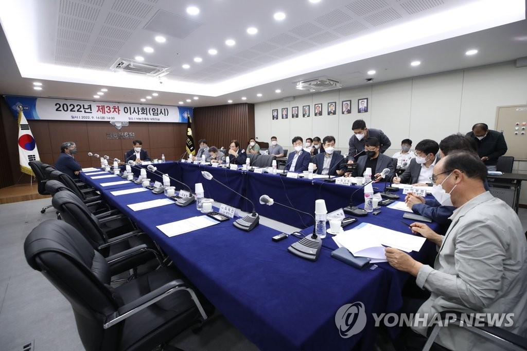 | ▲ 이사회 개최 전 비어 있는 우유 생산자 측 이사진들 (세종=연합뉴스) 강수환 기자 = 16일 오후 세종 낙농진흥회에서 열린 제3차 이사회에서 관계자들이 우유 생산자 이사진들을 기다리고 있다. 이번 이사회에서는 원유 용도별 차등가격제 도입을 골자로 한 낙동제도 개편안을 표결에 부친다. 정부는 지난해 8월부터 현행 원유가격 결정 제도인 생산비 연동제 개편을 추진해왔다. 2022.9.16 swan@yna.co.kr |