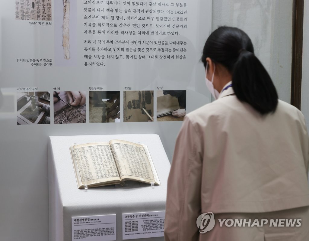 | ▲ 간송미술관 보화각서 7년여 만에 전시…문화재 32점 공개 (서울=연합뉴스) 류효림 기자 = 15일 오후 서울 성북구 성북동 간송미술관 보화각에서 열린 '보화수보' 전시 기자간담회에서 참석자가 '매헌선생문집'을 살펴보고 있다. 2022.4.15 ryousanta@yna.co.kr |