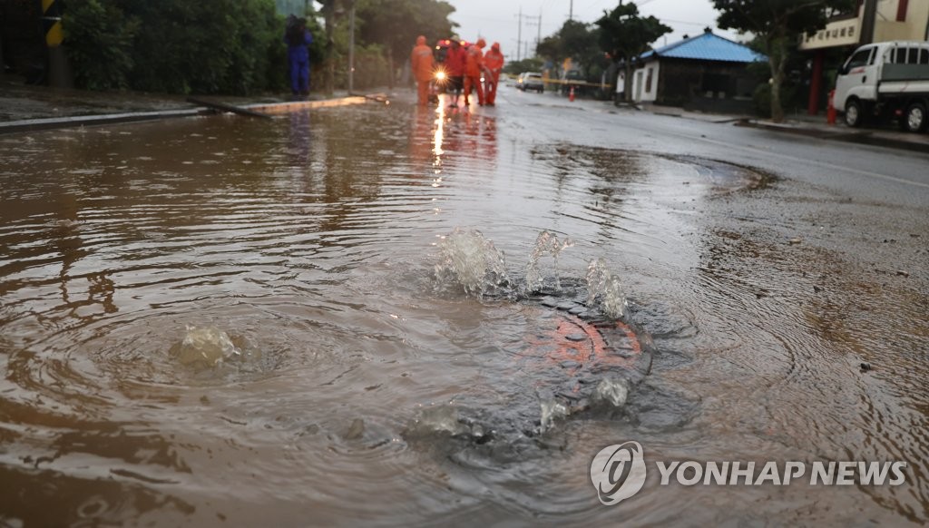 | ▲ Water pools around a backed-up drain on a road on the southern island of Jeju on Sept. 4, 2022, as Typhoon Hinnamnor travels toward the Korean Peninsula. (Yonhap) |
