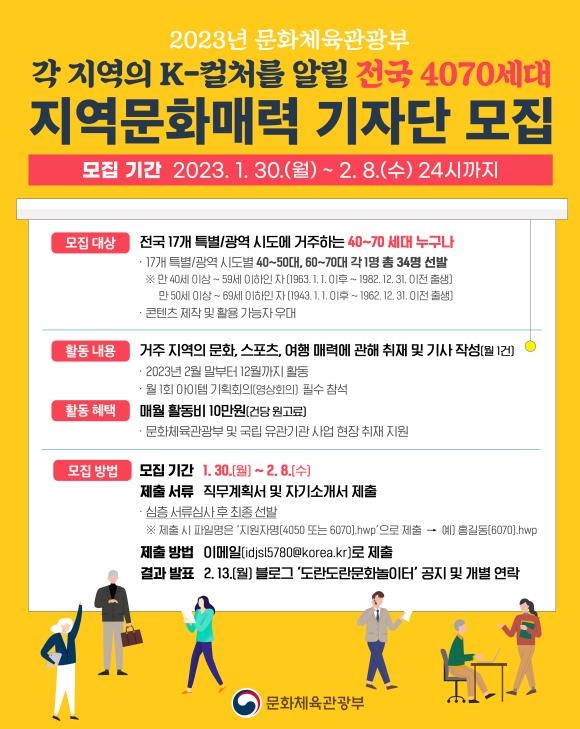 ▲ 4070 지역문화매력 기자단 선발 = 문체부는 전국 각 지역의 문화 매력을 SNS(누리소통망)를 통해 알릴 40~70대 기자단을 2월 8일까지 공모한다.