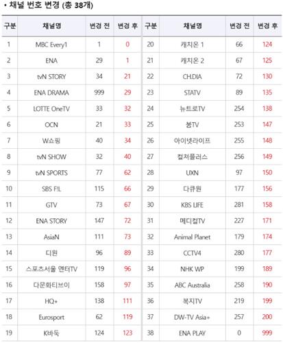 ENA 외에도 MBC에브리원은 0번, OCN은 33번, tvN스토리는 21번 등으로 변경되며, 변경된 총 38개 채널 번호는 17일부터 적용된다.