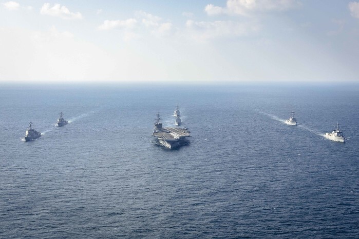 Warships of South Korea, the United States and Japan, including the USS George Washington aircraft carrier, the South's ROKS Seoae Ryu Seong-ryong destroyer and Japan's JS Haguro destroyer, take part in the trilateral Freedom Edge exercise in international waters south of South Korea's southern resort island of Jeju on Nov. 13, 2024, in this photo provided by the South's Joint Chiefs of Staff the following day. (PHOTO NOT FOR SALE) (Yonhap)