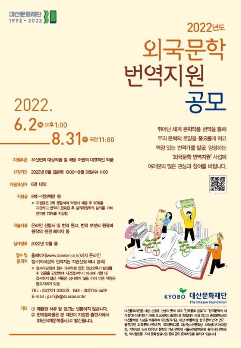 | ▲ '2022년도 외국문학 번역지원 공모' 포스터 [대산문화재단 제공] |