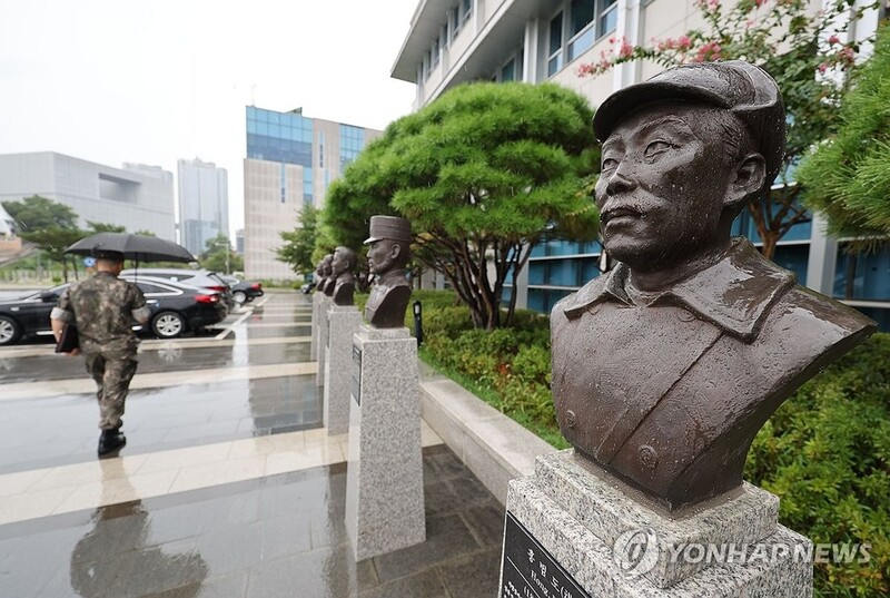 | ▲ This photo, taken Aug. 28, 2023, shows a bust (R) of revered independence fighter Hong Beom-do installed at the headquarters of the defense ministry in Seoul. The government is considering relocating the bust due to his past record of collaborating with Soviet communist forces. (Yonhap) |