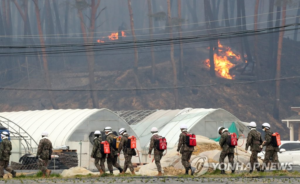 | ▲ 강릉 산불…군인 진화작업 투입 (강릉=연합뉴스) 유형재 기자 = 11일 오전 강원 강릉시 난곡동의 한 야산에서 난 불이 확산하는 가운데 저동 일대 진화작업을 위해 군인들이 투입되고 있다. 2023.4.11 yoo21@yna.co.kr |