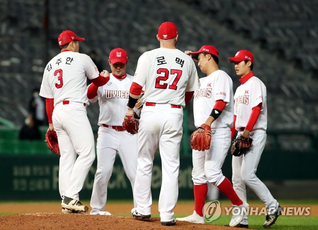 ▲ In this file photo from Oct. 11, 2020, members of the SK Wyverns celebrate their 9-5 victory over the Kia Tigers in a Korea Baseball Organization regular season game at Gwangju-Kia Champions Field in Gwangju, 330 kilometers south of Seoul. (Yonhap)