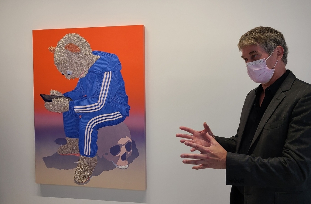 | ▲ (서울=연합뉴스) 김준억 기자 = 큐레이터 댄 캐머런이 19일 BB&M 갤러리에서 전시작을 설명하고 있다. 2022.5.19. |