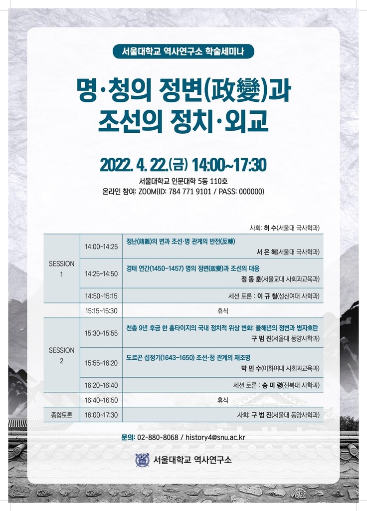 ▲ 서울대 역사연구소 학술 세미나 = 서울대 역사연구소는 22일 '명·청의 정변(政變)과 조선의 정치·외교'를 주제로 학술 세미나를 개최한다.