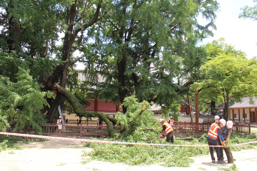 1일 종로구청과 성균관 등에 따르면 이날 낮 12시 25분께 문묘의 명륜당 경내에 있는 은행나무 지지대를 교체하는 과정에서 직경 90㎝와 30㎝ 정도의 가지 2개가 부러졌다.
