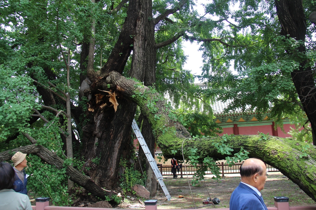 (서울=연합뉴스) 양정우 김예나 기자 = 수령이 400년 정도로 추정되는 서울 성균관 문묘(文廟)의 천연기념물 은행나무가 지지대 교체 작업 중 크게 파손됐다.