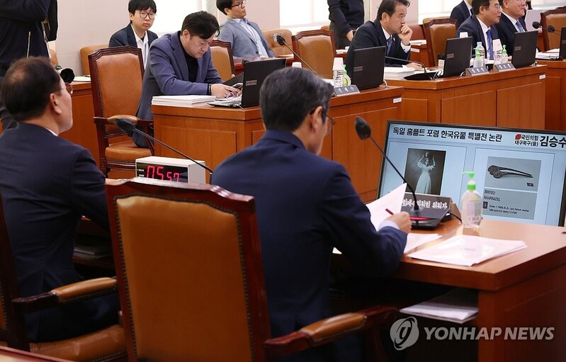 ▲ 독일 훔폴트포럼 한국유물 전시 지적 (서울=연합뉴스) 신준희 기자 = 23일 국회에서 열린 문화체육관광위원회 국정감사에서 국민의힘 김승수 의원이 윤성용 국립중앙박물관장(왼쪽)에게 독일 훔폴트 포럼 한국유물 특별전 관련 질의를 하고 있다. 2023.10.23 hama@yna.co.kr