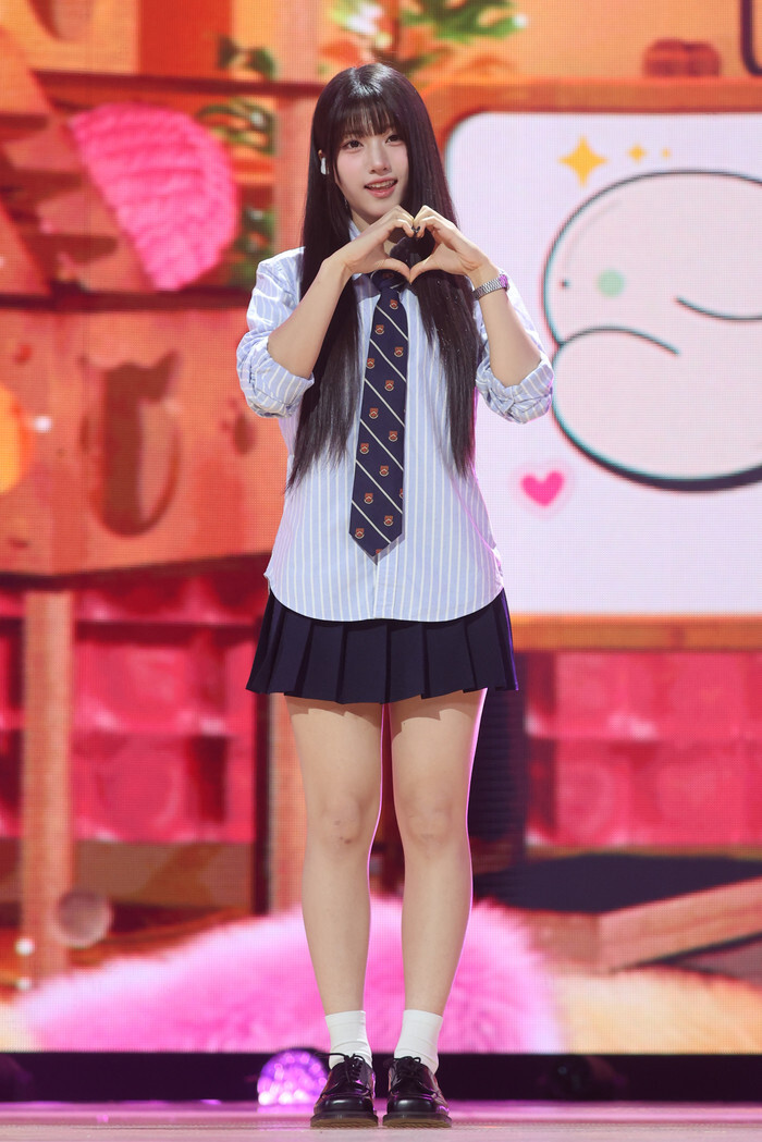 Junhwi, a member of South Korean girl group Say My Name, poses for photo during a showcase for the group's debut album with title song "WaveWay" in Seoul on Oct. 15, 2024. (Yonhap)