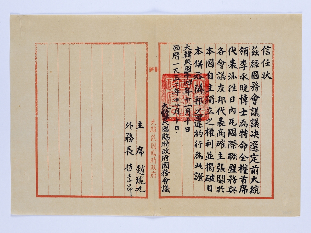 | ▲ 이승만 박사를 제네바 국제연맹회의에 파견한다는 신임장 [독립기념관 제공. 재판매 및 DB 금지] |