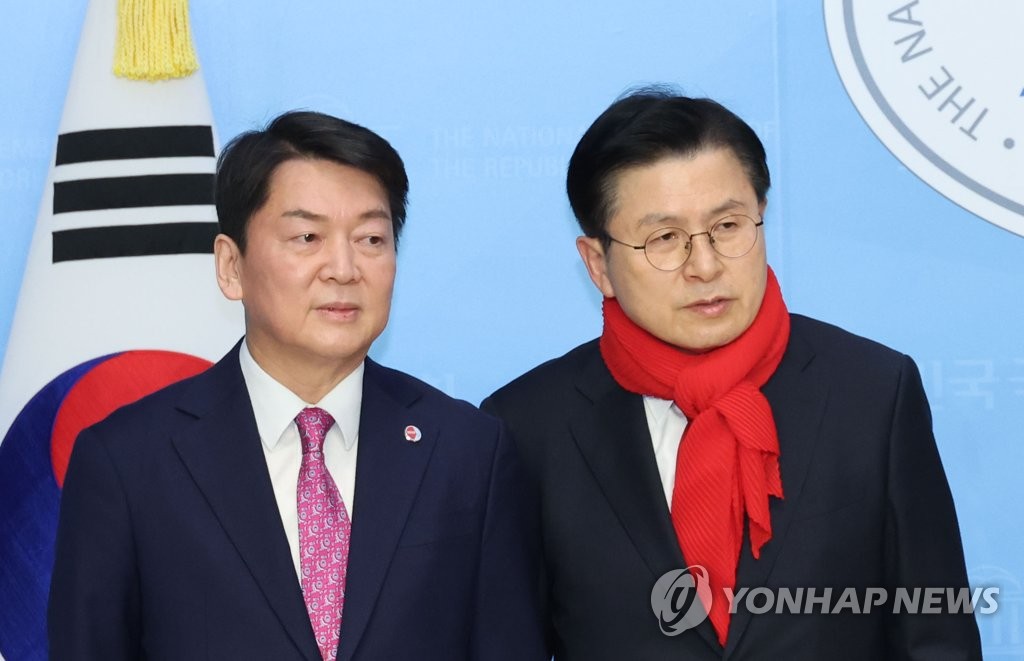 | ▲ Rep. Ahn Cheol-soo (L) and former Prime Minister Hwang Kyo-ahn attend a press conference at the National Assembly in Seoul on March 7, 2023, calling on Rep. Kim Gi-hyeon to withdraw from the election to pick a new leader for the ruling People Power Party. (Yonhap) |