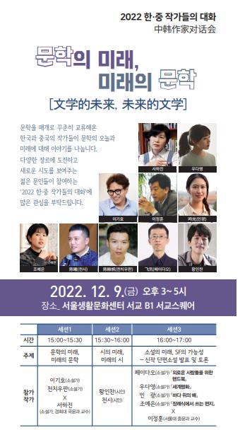 이번 행사는 다음 달 9일 오후 3시 '문학의 미래, 미래의 문학'을 주제로 온라인으로 진행된다. 한국 작가들은 서울 마포구 서교스퀘어에서 화상회의 플랫폼 줌으로 중국 작가들과 의견을 나눈다.