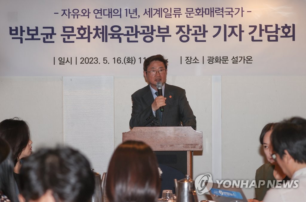 | ▲ 취임 1주년 맞이한 박보균 문체부 장관 (서울=연합뉴스) 류효림 기자 = 박보균 문화체육관광부 장관이 16일 서울 광화문 설가온에서 열린 취임 1주년 기념 기자간담회에서 인사말을 하고 있다. 2023.5.16 ryousanta@yna.co.kr |