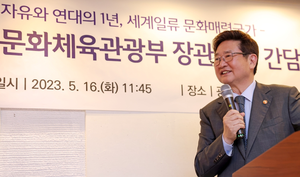 | ▲ 취임 1주년 맞이한 박보균 문화체육관광부 장관 (서울=연합뉴스) 류효림 기자 = 박보균 문화체육관광부 장관이 16일 서울 광화문 설가온에서 열린 취임 1주년 기념 기자간담회에 참석하고 있다. 2023.5.16 ryousanta@yna.co.kr |