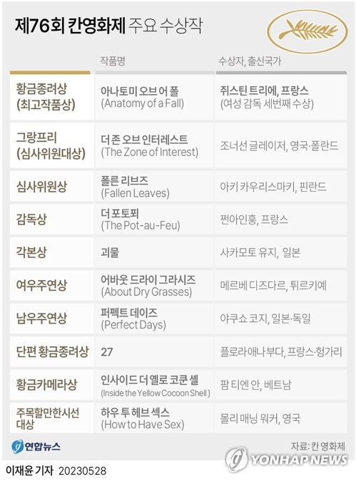 | ▲ [그래픽] 제76회 칸영화제 주요 수상작 (서울=연합뉴스) 이재윤 기자 = 27일(현지시간) 폐막한 제76회 칸국제영화제에서 '아나토미 오브 어 폴'을 연출한 프랑스 여성 감독 쥐스틴 트리에가 최고상인 황금종려상을 받았다. 여성 감독이 황금종려상을 받은 것은 '피아노'(1993)의 제인 캠피온, '티탄'(2021)의 쥘리아 뒤쿠르노에 이어 이번이 세 번째다. yoon2@yna.co.kr 트위터 @yonhap_graphics 페이스북 tuney.kr/LeYN1 |
