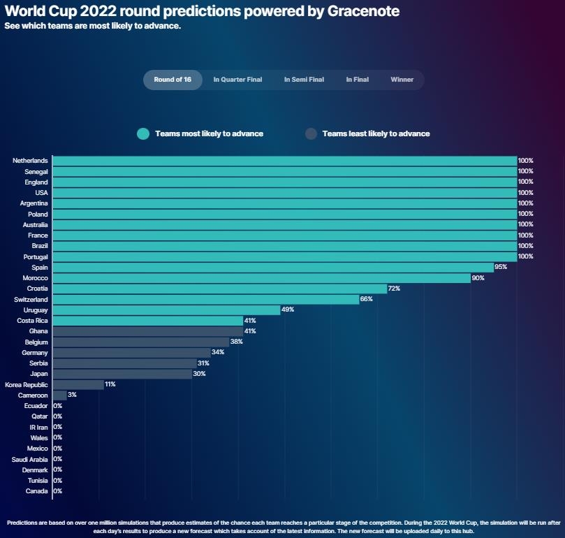 그레이스노트는 E조 스페인(95%)과 코스타리카(41%), F조 모로코(90%)와 크로아티아(72%), G조 이미 16강에 간 브라질을 빼고 스위스(66%)의 조별리그 통과 가능성을 높게 봤다.