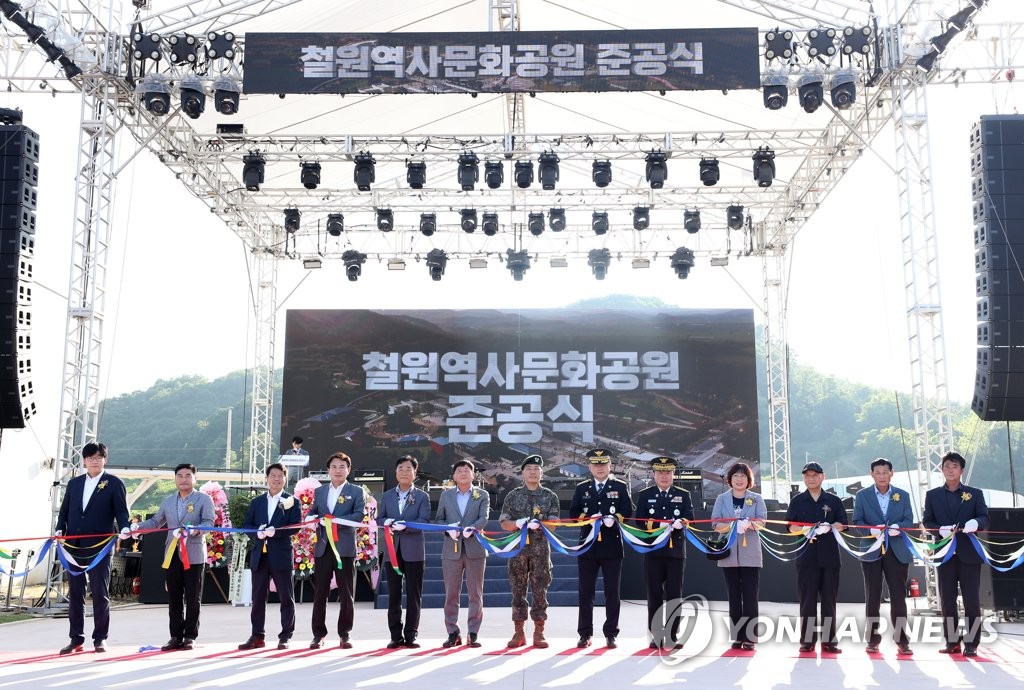 (철원=연합뉴스) 양지웅 기자 = 강원 철원군이 옛 북한 노동당사 앞에 조성 중인 철원역사문화공원 건립을 마치고 6·25 정전협정 기념일인 27일 오후 준공식과 함께 정식 운영을 시작했다.