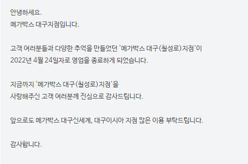 메가박스는 8일 홈페이지 공지사항을 통해 "고객 여러분들과 다양한 추억을 만들었던 메가박스 대구지점이 2022년 4월 24일 자로 영업을 종료하게 됐다"고 밝혔다.