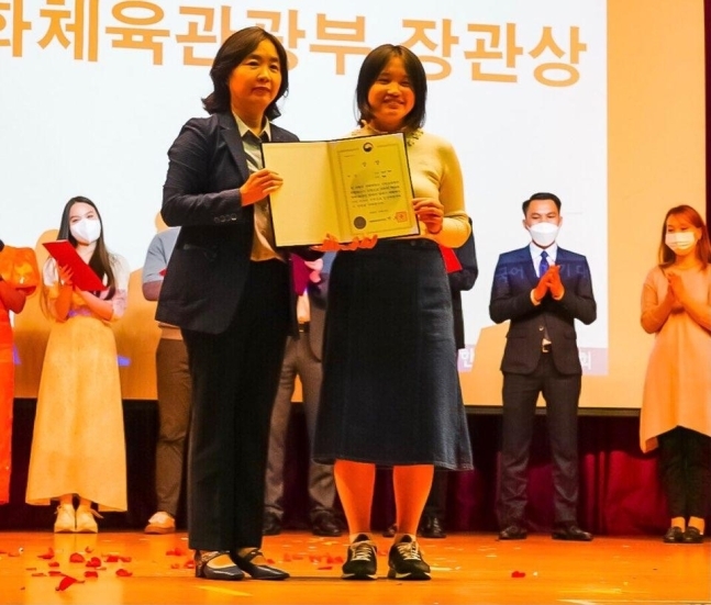| ▲ 강현화 심사위원장(왼쪽)으로부터 상장을 받는 오노다 유카씨 [촬영 이동칠 기자] |