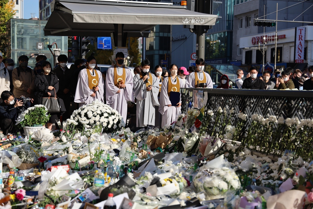 2일 종교계에 따르면 원불교 서울교구는 이날 서울 동작구 한강교당에서 합동위령재를 올렸다. 이어 젊은 교무(성직자)들을 중심으로 서울 용산구 이태원역 1번 출구 앞에 마련된 추모 장소로 이동해 희생자들의 해탈 천도를 바라는 기도를 했다.