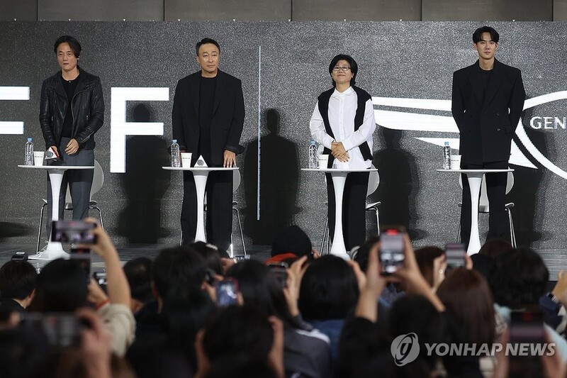 | ▲ Pil Gam-seong, director of Tving series "A Bloody Lucky Day," and cast members (from L to R) -- Lee Seong-min, Lee jung-eun and Yoon Yeon-seok -- attend the Open Talk session at the Busan International Film Festival in the southeastern port city of Busan on Oct. 6, 2023. (Yonhap) |