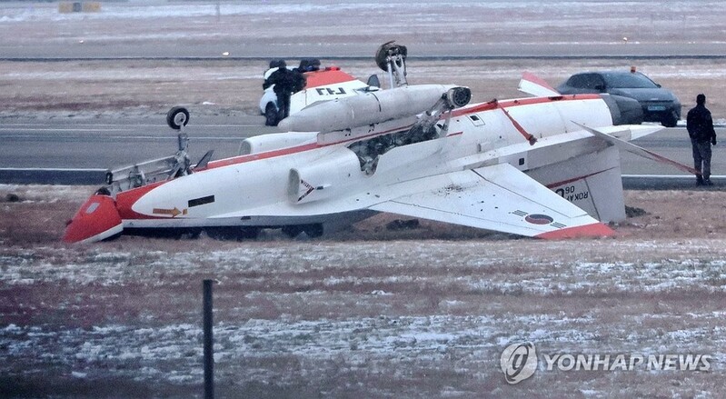 | ▲ This photo shows a T-50 training aircraft laying flipped over after making an emergency landing at an airport in Gwangju, about 300 kilometers south of Seoul, on Jan. 2, 2026. (Yonhap) |