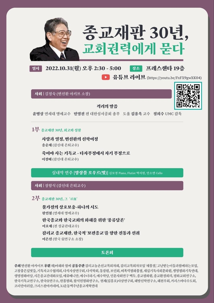 오는 31일 서울 중구 한국프레스센터에서 '종교재판 30년, 교회권력에게 묻다'를 주제로 열리는 학술대회에서는 변선환 박사의 신학 세계를 짚어보고, 당시 왜 출교라는 가혹한 조치가 이뤄졌는지 돌아본다.