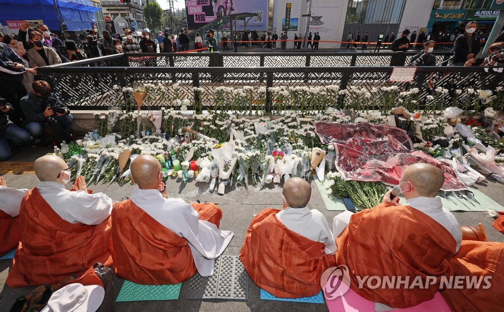 스님들은 목탁을 치고, 염불을 외며 사고로 숨진 이들의 극락왕생을 기원했다. 이들은 폴리스라인이 쳐진 사고 현장 앞까지 이동해 애도의 뜻을 표했다.