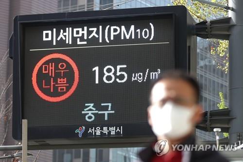 | ▲ A pedestrian walks in front of an electronic display showing the fine dust level for the air in Seoul on April, 12. 2023. (Yonhap) |