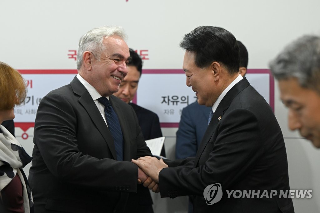 | ▲ President Yoon Suk Yeol (R) and U.S. National Security Council Coordinator for Indo-Pacific Affairs Kurt Campbell shake hands during the inaugural session of the Nuclear Consultative Group at the presidential office in Seoul on July 18, 2023, in this photo provided by the office. (PHOTO NOT FOR SALE) (Yonhap) |