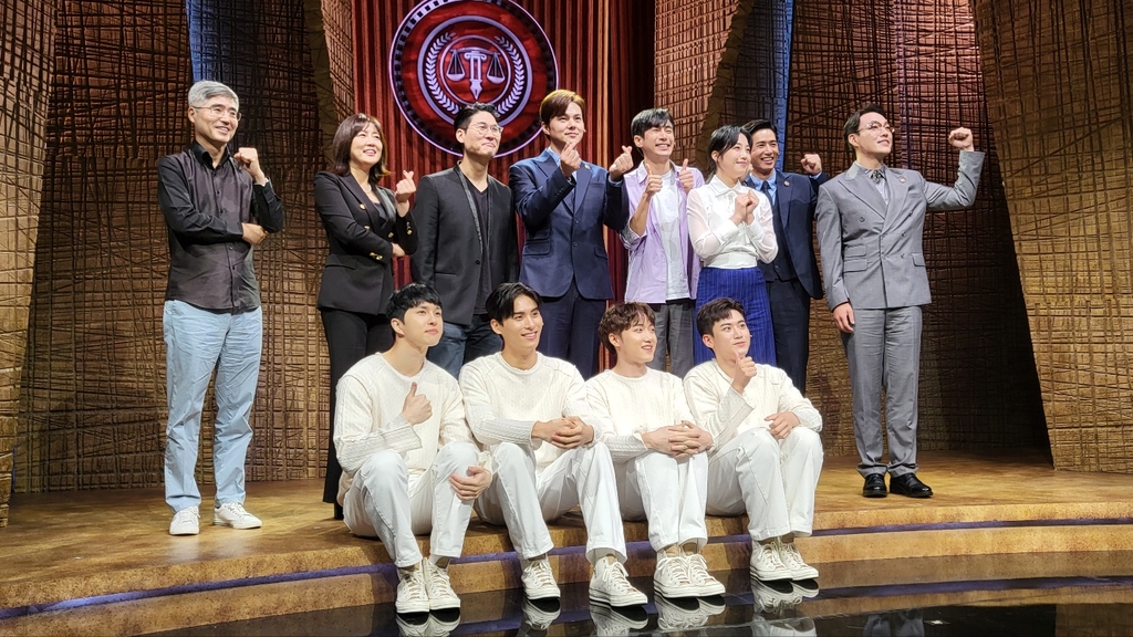 | ▲ "뮤지컬 '인간의 법정', 화이팅" (서울=연합뉴스) 임지우 기자 = 6일 오후 서울 대학로 아트원씨어터에서 열린 뮤지컬 '인간의 법정' 프레스콜에서 배우와 창작진이 포즈를 취하고 있다. 2022.10.06.wisefool@yna.co.kr |