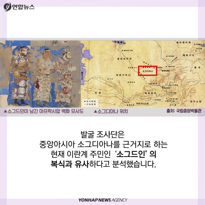 발굴 조사단은 중앙아시아 소그디아나를 근거지로 하는 현재 이란계 주민인 '소그드인'의 복식과 유사하다고 분석했습니다.
