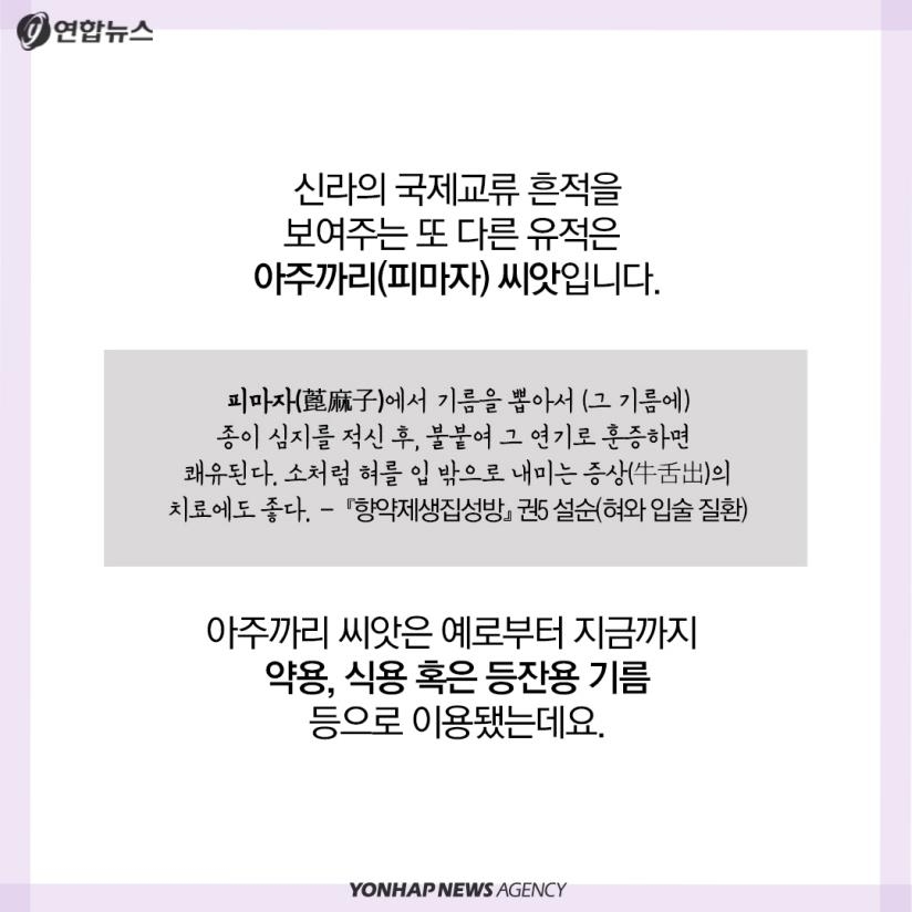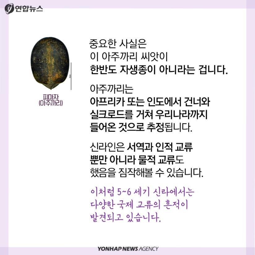 신라의 국제교류 흔적을 보여주는 또 다른 유적은 아주까리(피마자) 씨앗입니다.
