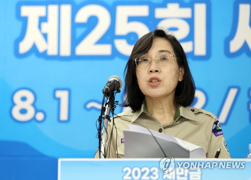 ▲ 발표하는 김현숙 장관 (부안=연합뉴스) 정경재 기자 = 김현숙 여성가족부 장관이 6일 2023 새만금 세계스카우트잼버리 프레스센터에서 브리핑하고 있다. 2023.8.6 jaya@yna.co.kr