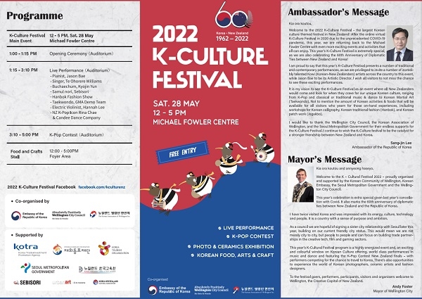 주뉴질랜드대사관(대사 이상진)은 23일 보도 자료를 통해 오는 28일 웰링턴 마이클파울러센터에서 2022 K-컬처 페스티벌이 열린다며 이 행사는 대사관이 2015년부터 웰링턴 시청, 웰링턴 한인회와 공동으로 주최해온 종합 문화행사로 올해는 양국 수교 60주년을 기념하는데 특별한 의미가 있다고 밝혔다.
