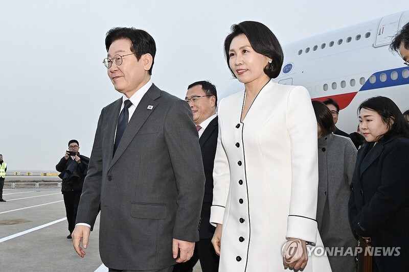 | ▲ President Lee Jae Myung (L) and first lady Kim Hea Kyung arrive at Shanghai Pudong International Airport in Shanghai on Jan. 6, 2026. (Yonhap) |