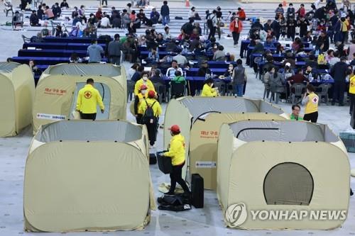 ▲ Korean Red Cross officials set up disaster relief shelters for wildfire victims at the Gangneung Ice Arena in the northeastern coastal city on April 11, 2023. (Yonhap)